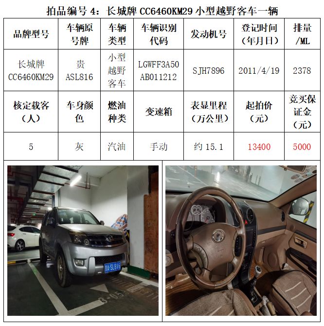 一、拍賣標的:雅閣HG7200小型轎車1輛、別克牌SGM6527AT小型普通客車1輛、途勝KMHJN81D95U小型越野客車1輛、長城牌CC6460KM29小型越野客車1輛、雪佛蘭SGM6470TAXD小型普通客車1輛、尼桑牌ZN6453WAG3小型普通客車1輛,索蘭托KNAKU811小型普通客車1輛,共計7輛車。
