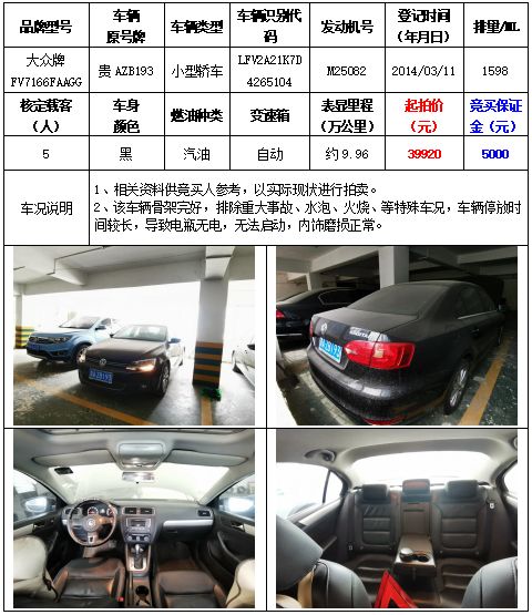 拍品編號(hào)1:大眾牌FV7166FAAGG小型轎車(chē)一輛