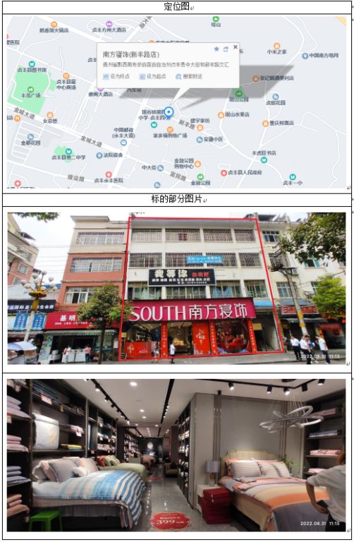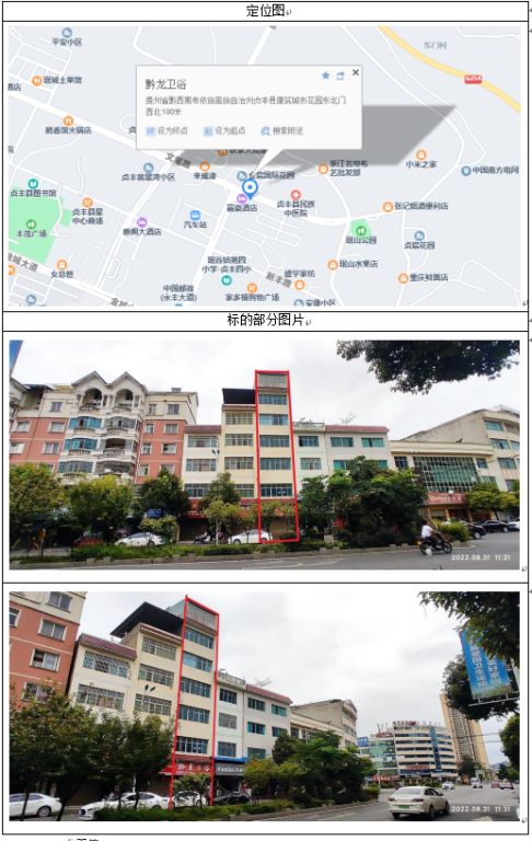 標(biāo)的位于貞豐縣龍場(chǎng)鎮(zhèn)興龍商貿(mào)區(qū),房屋總層數(shù)為6層。產(chǎn)權(quán)證號(hào):貞房權(quán)證龍場(chǎng)鎮(zhèn)字第20120349號(hào)、貞國(guó)用2012第004022號(hào),房屋證載建筑面積2278.03㎡(實(shí)測(cè)面積2263.59㎡),其中商用建筑面積:1818.71㎡,住宅建筑面積:459.32㎡;規(guī)劃用途為商住,混合結(jié)構(gòu)。證載土地面積1152㎡(實(shí)測(cè)面積1183.74㎡),地類用途為商住,使用權(quán)類型為出讓,土地使用權(quán)終止日期為2058年9月6日。