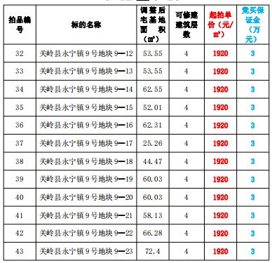 關(guān)嶺縣永寧鎮(zhèn)43宗宅基地,面積:25.26-173.44㎡,起拍價(jià):717-1997元/㎡。
