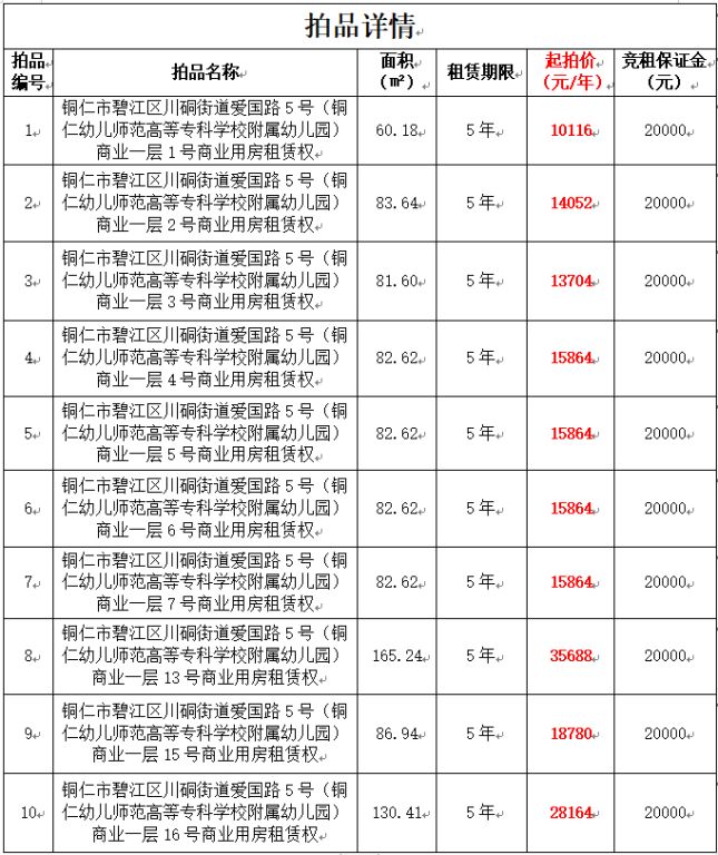 10、銅仁市碧江區(qū)川硐街道愛國路5號(銅仁幼兒師范高等專科學(xué)校附屬幼兒園)商業(yè)一層16號商業(yè)用房租賃權(quán),面積130.41㎡,租賃期限5年,起拍價(jià):28164/年,競租保證金:2萬元。