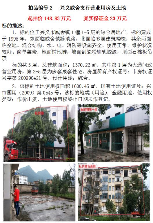 二、興義威舍支行營(yíng)業(yè)用房及土地,建筑面積1370.22㎡;