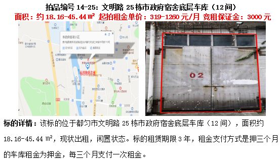 13、文明路25棟市政府宿舍底層車庫(kù)(12間)3年租賃權(quán)(面積約18.16㎡-45.44㎡)。