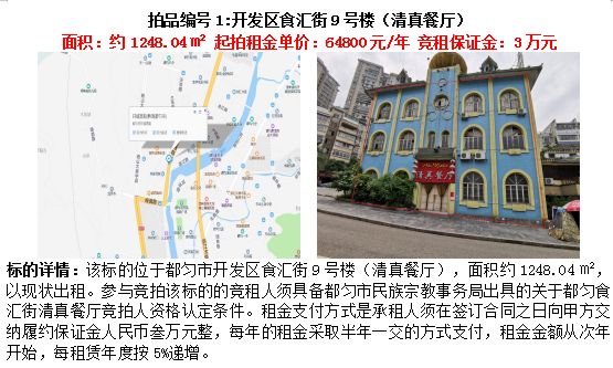 1、都勻市開發(fā)區(qū)食匯街9號(hào)樓(清真餐廳)5年租賃權(quán)(面積約1248.04㎡);