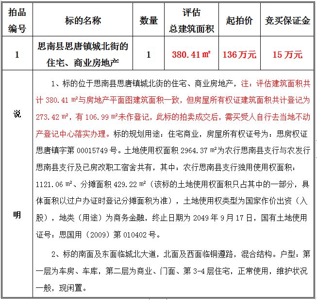1、思南縣思唐鎮(zhèn)城北街的住宅、商業(yè)房地產,建筑面積共:380.41㎡;起拍價:136萬元;競買保證金15萬元。
