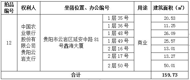 拍品編號(hào)12:貴陽市云巖區(qū)延安中路81號(hào)鑫海大廈1層35、36、48、49號(hào)及2層16、17、50號(hào)