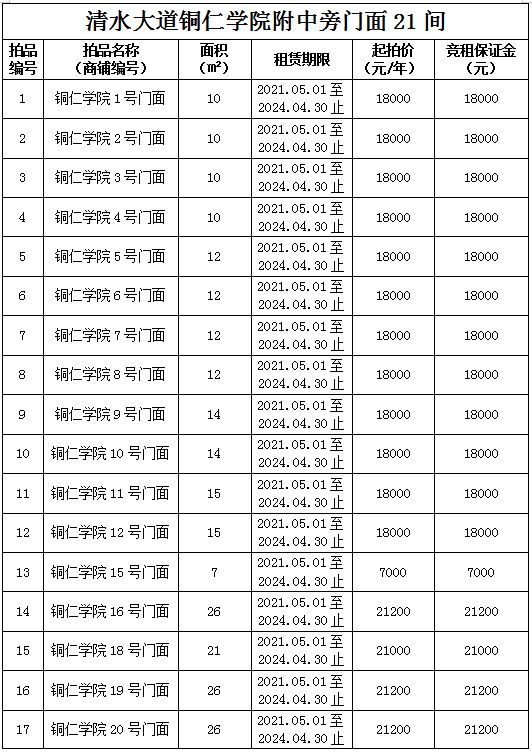 1.拍品1至21號(hào)標(biāo)的位于銅仁市清水大道銅仁學(xué)院附中旁,面積7——28㎡,租賃期3年(2021.05.01至2024.04.30止),交通便利,人流量大。