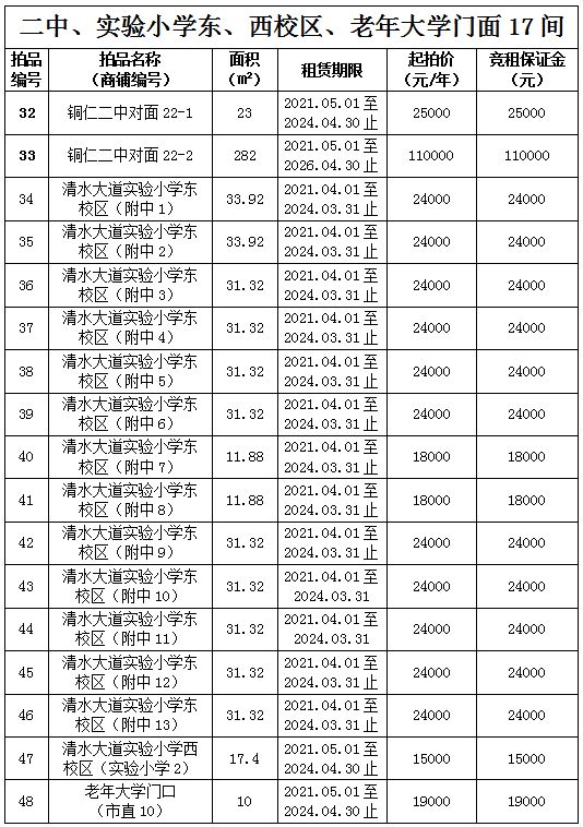1.拍品32號(hào)標(biāo)的位于銅仁二中對(duì)面,面積23㎡,租賃期3年(2021.05.01至2024.04.30);