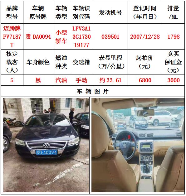 拍品編號(hào)1:邁騰牌FV7187T小型轎車(chē)一輛
