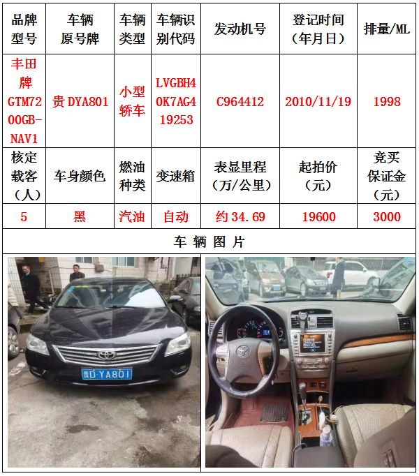 拍品編號(hào)2:豐田牌GTM7200GB-NAV1小型轎車(chē)一輛