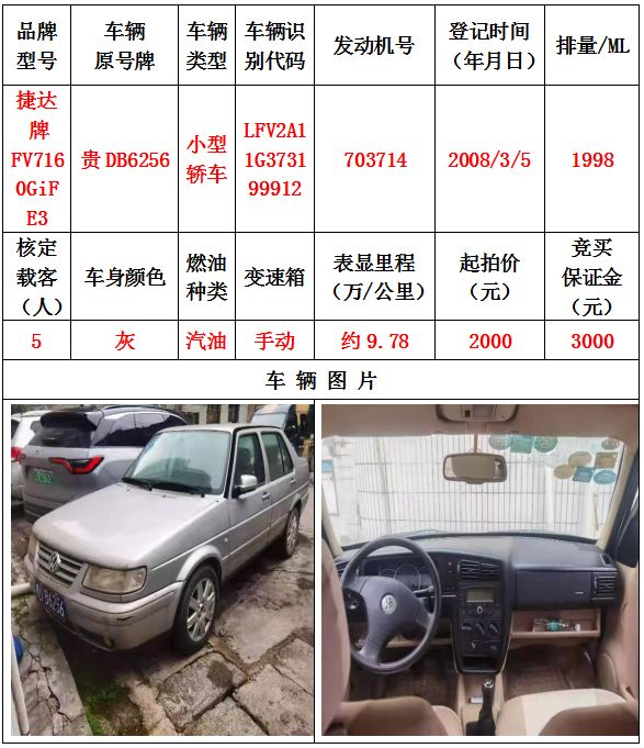 拍品編號(hào)3:捷達(dá)牌FV7160GiF E3小型轎車(chē)一輛