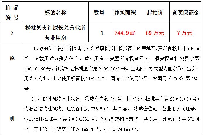 3、松桃縣支行原長(zhǎng)興營(yíng)業(yè)所營(yíng)業(yè)用房,建筑面積共:744.9㎡;起拍價(jià):69萬(wàn)元;競(jìng)買(mǎi)保證金:7萬(wàn)元。