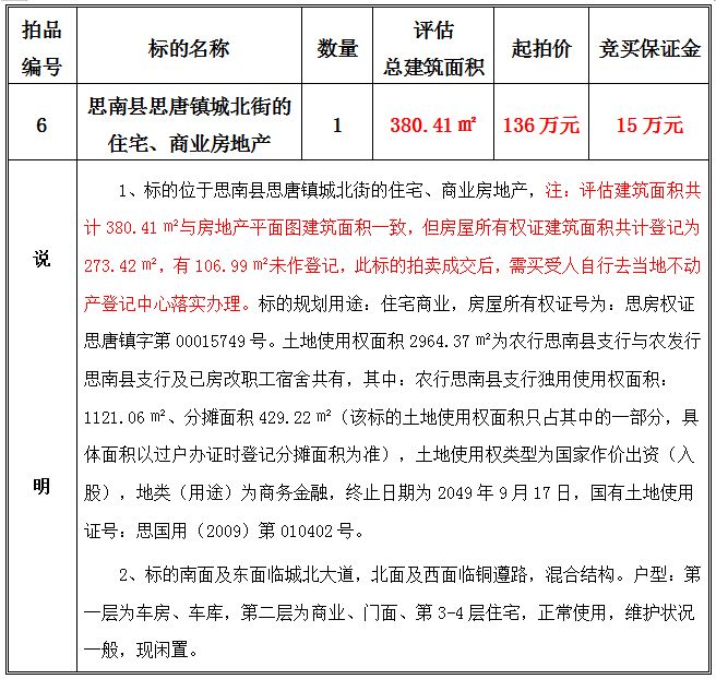 2、思南縣思唐鎮(zhèn)城北街的住宅、商業(yè)房地產(chǎn),建筑面積共:380.41㎡;起拍價(jià):136萬(wàn)元;競(jìng)買(mǎi)保證金15萬(wàn)元。