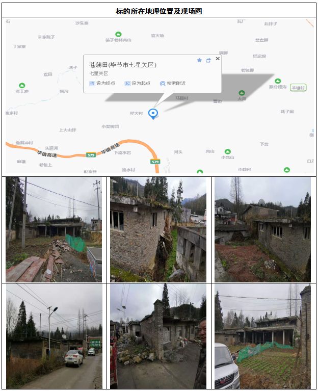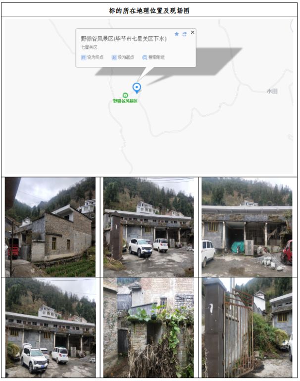 標的位于畢節(jié)市七星關(guān)區(qū)海子街鎮(zhèn)王張村,房屋總層數(shù)二層,建成于1991年。總建筑面積:987.15㎡,其中套內(nèi)建筑面積:910.31㎡,共有分攤面積:76.84㎡;土地面積:1414.92㎡,磚混結(jié)構(gòu),無房產(chǎn)證,國有土地使用證:畢市國用(95)字第23-001號,用途為:倉儲,土地性質(zhì)為:劃撥用地。
