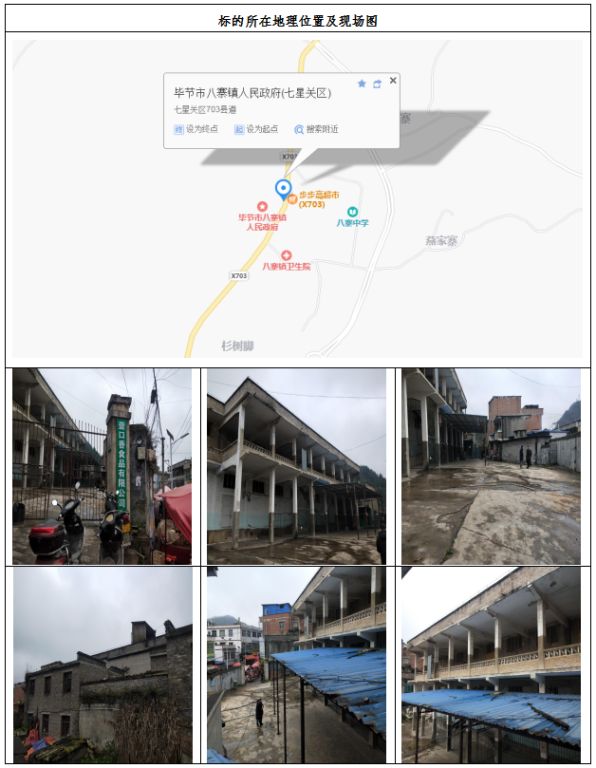 標的位于畢節(jié)市七星關(guān)區(qū)海子街鎮(zhèn)八寨鄉(xiāng),房屋總層數(shù)二層,建成于1989年。總建筑面積:1393.78㎡,其中套內(nèi)建筑面積:1277.41㎡,共有分攤面積:116.37㎡;土地面積:1515.17㎡,磚混結(jié)構(gòu),無房產(chǎn)證,國有土地使用證:畢市國用(95)字第27-004號,用途為:倉儲,土地性質(zhì)為:劃撥用地。