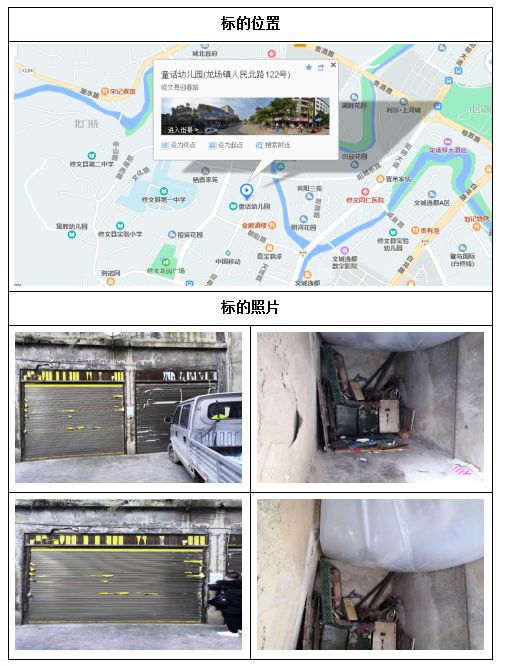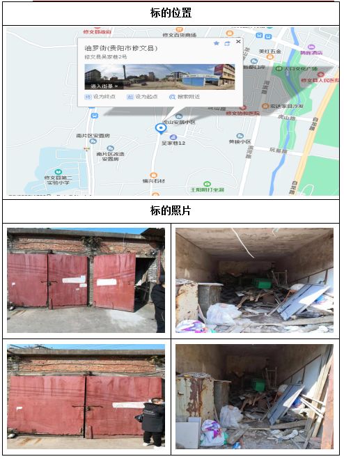 標(biāo)的位于修文縣龍場鎮(zhèn)迎春路52號,建筑面積為30㎡,共兩個(gè)獨(dú)立車庫。實(shí)際用途為車庫,該標(biāo)的東至迎春路,南至小區(qū)道路,西至小區(qū)道路,北至小區(qū)道路;建筑結(jié)構(gòu)為磚混結(jié)構(gòu),層高約3米,無物業(yè)管理,戶型結(jié)構(gòu)為開間。