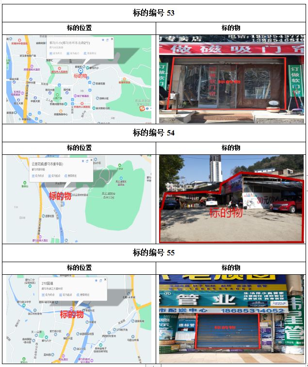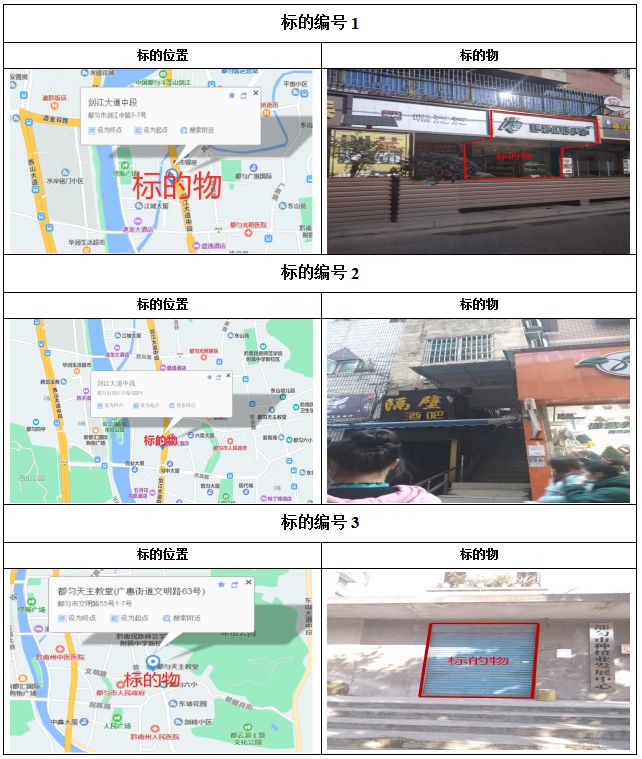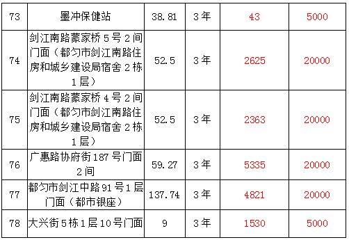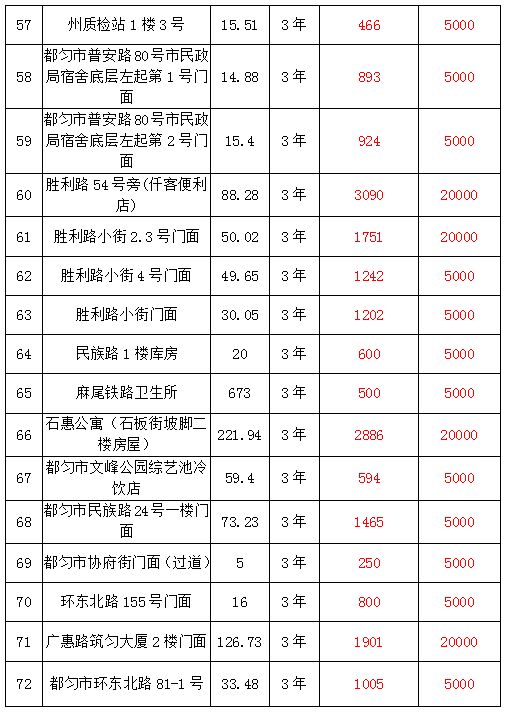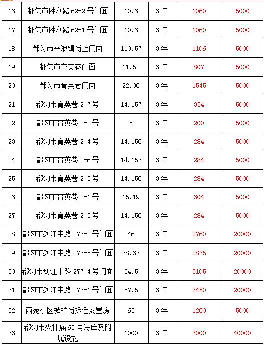 1、都勻市劍江中路、環(huán)東北路、文明路、民族路、勝利路、會云橋、育英巷等62處門面3年租賃權(quán),面積約5㎡-137.74㎡;