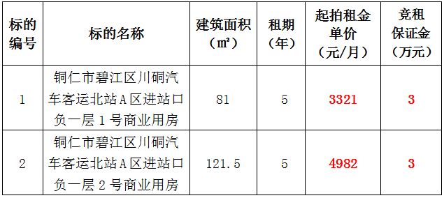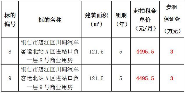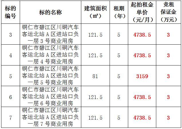 3、銅仁市碧江區(qū)川硐汽車客運(yùn)北站A區(qū)進(jìn)站口負(fù)一層3號(hào)門面,面積:121.5㎡,租賃期:5年,起拍租金:4738.5元/月,競(jìng)租保證金:3萬元;