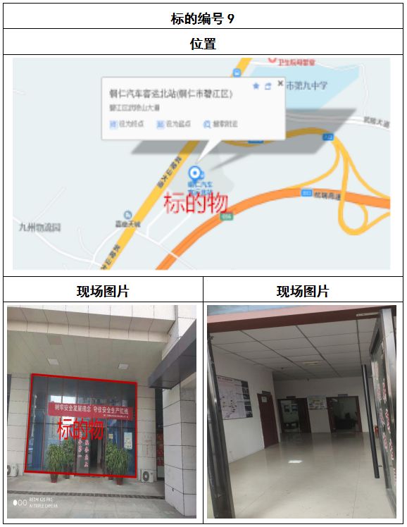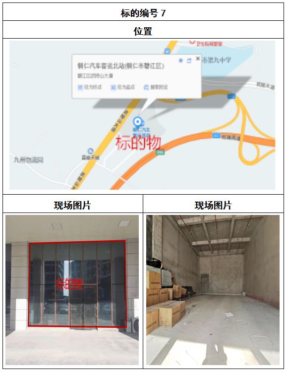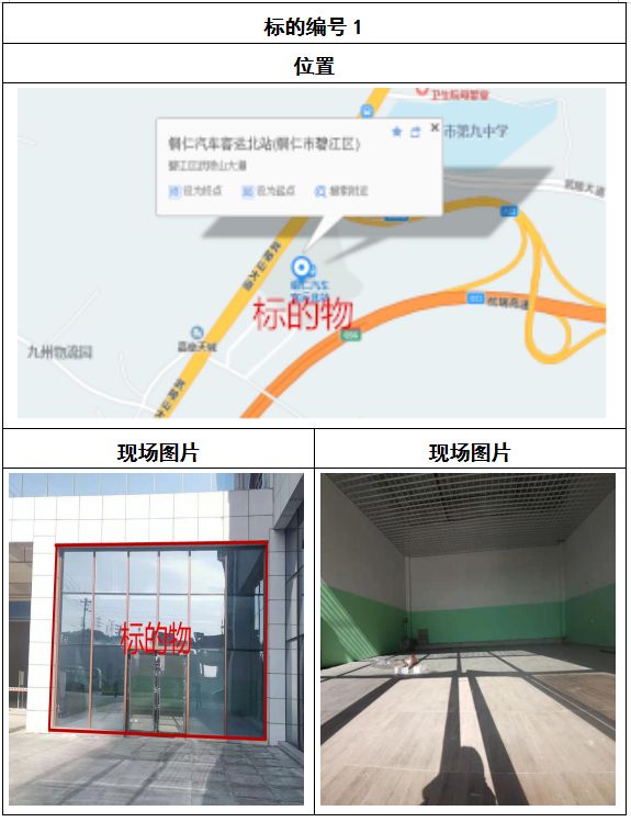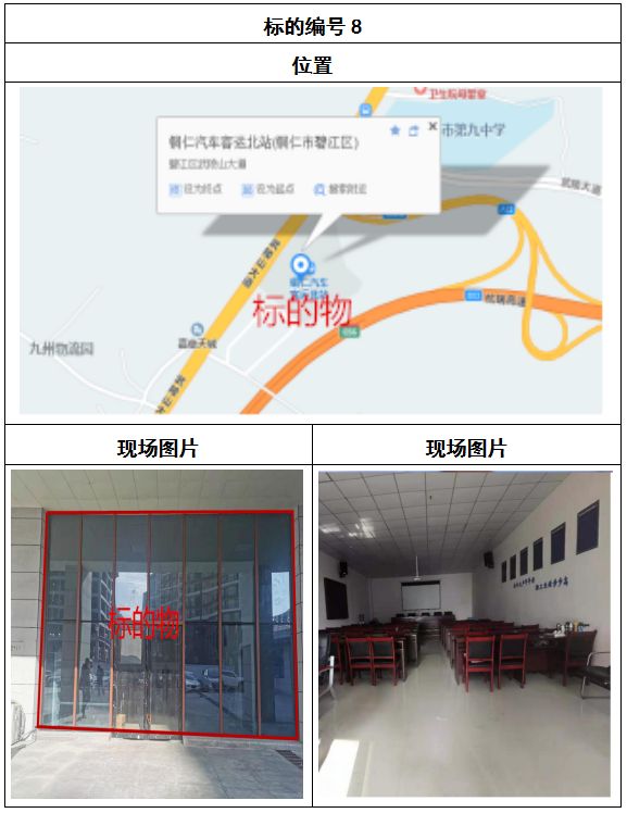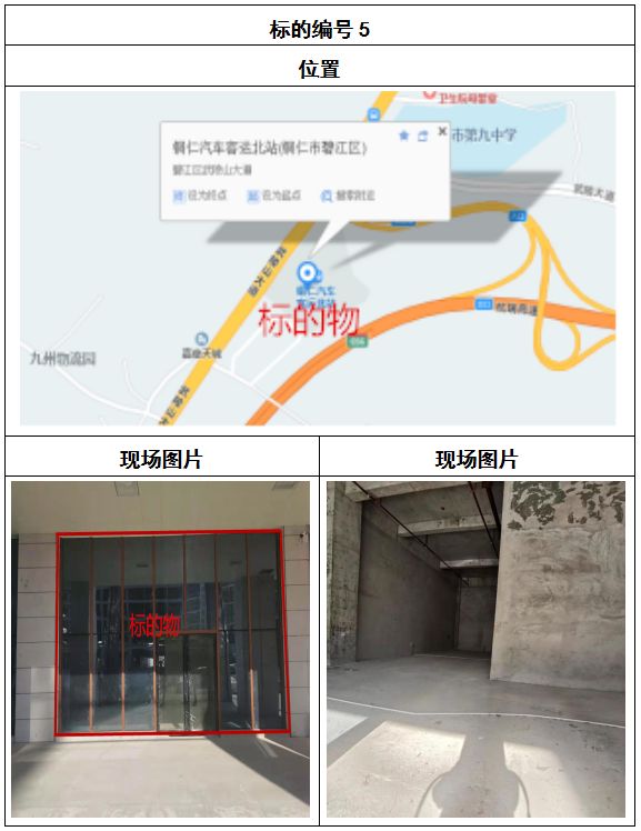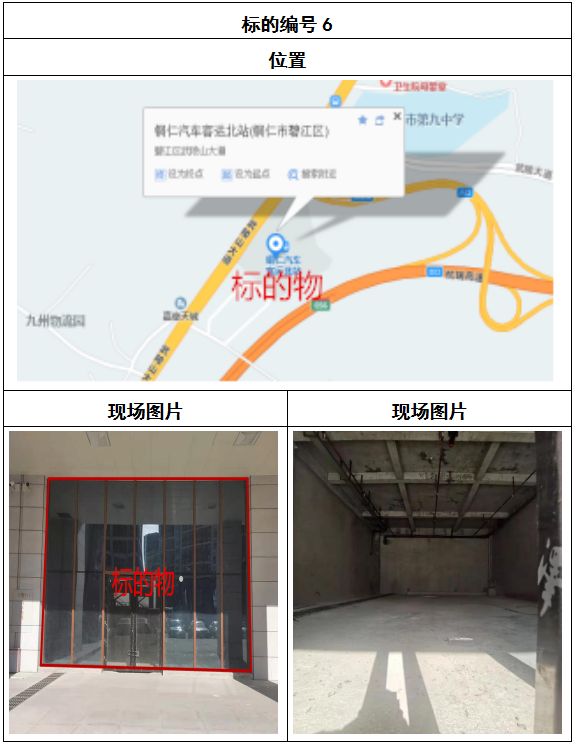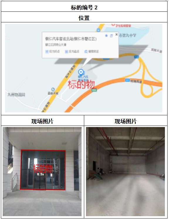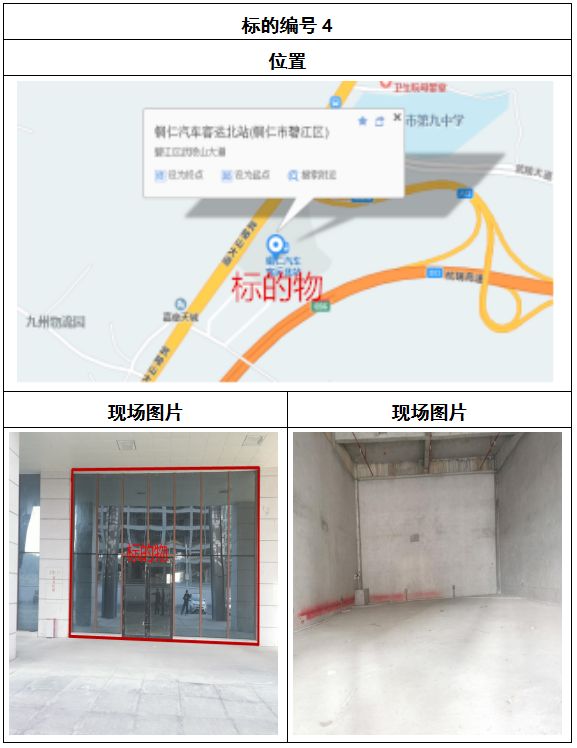 拍品8號(hào)和9號(hào)標(biāo)的位于銅仁碧江區(qū)川硐汽車客運(yùn)北站A區(qū)進(jìn)站口負(fù)一層8-9號(hào)的商業(yè)房地產(chǎn),位于銅仁市中心以北,銅仁汽車北站安置旁,建筑面積分別為:121.5㎡、121.5㎡,租賃期5年,該標(biāo)的位置交通便利,人流量大。