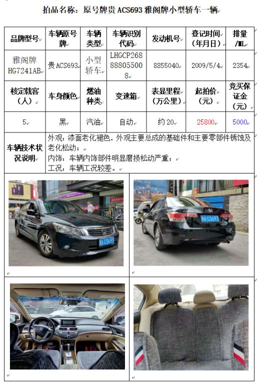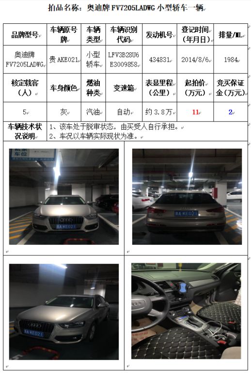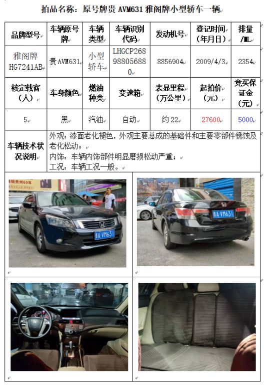 貴州春秋拍賣 奧迪牌、雅閣牌等3輛機(jī)動(dòng)車拍賣公告