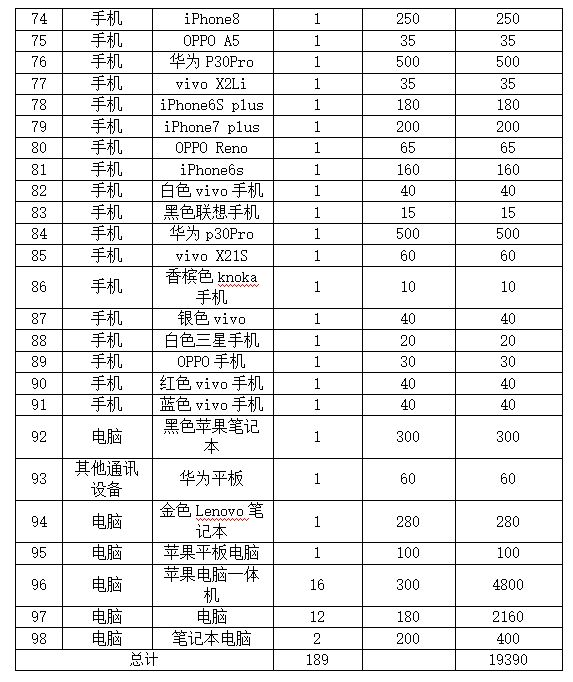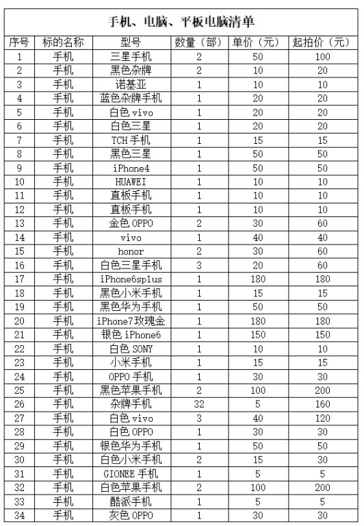 該批標(biāo)的包含各類品牌手機(jī)155部、電腦33臺、平板電腦1臺。(詳見后附手機(jī)、電腦、平板電腦清單),該批手機(jī)、電腦、平板電腦因長期閑置,存在電池?zé)o電,無法開機(jī)等影響使用的情況。