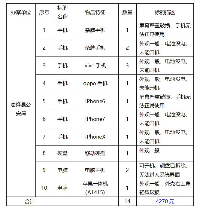 該批標(biāo)的包含各類品牌手機(jī)10部;電腦主機(jī)2臺;蘋果一體機(jī)1臺;移動硬盤1個。