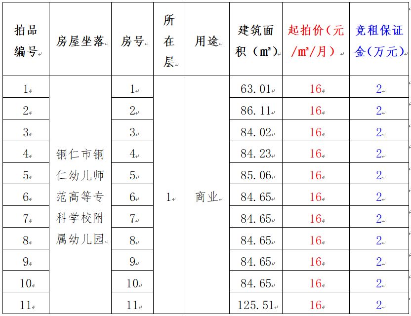 1銅仁幼兒師范高等??茖W(xué)校附屬幼兒園一層111號商業(yè)房地產(chǎn)11間門面拍租,建筑面積:63.01-125.51㎡,拍租經(jīng)營期限:5年,起拍價:16//月;