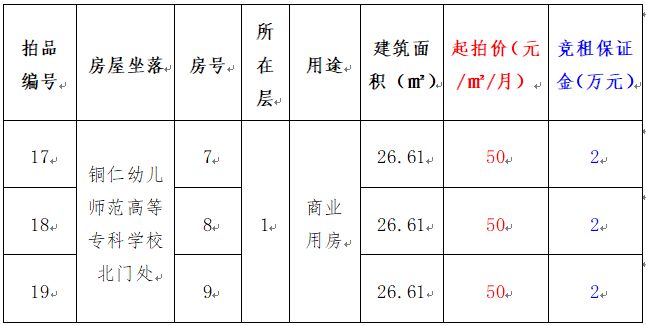 2、銅仁幼兒師范高等??茖W(xué)校附屬幼兒園1216號商業(yè)房地產(chǎn)5間門面拍租,建筑面積:88.35-334.13㎡,拍租經(jīng)營期限:5年。起拍價:19//月;