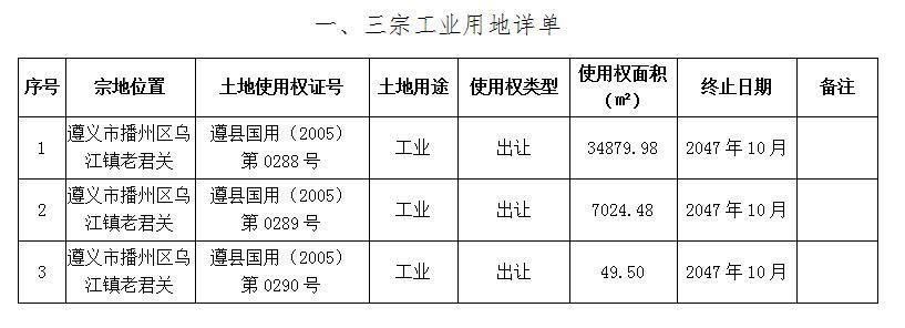 遵義市播州區(qū)烏江鎮(zhèn)老君關(guān)三宗工業(yè)用地及地上住宅、辦公、食堂、門衛(wèi)用房等房地產(chǎn)(土地使用權(quán)總面積41953.96㎡,總建筑面積3643.56㎡)