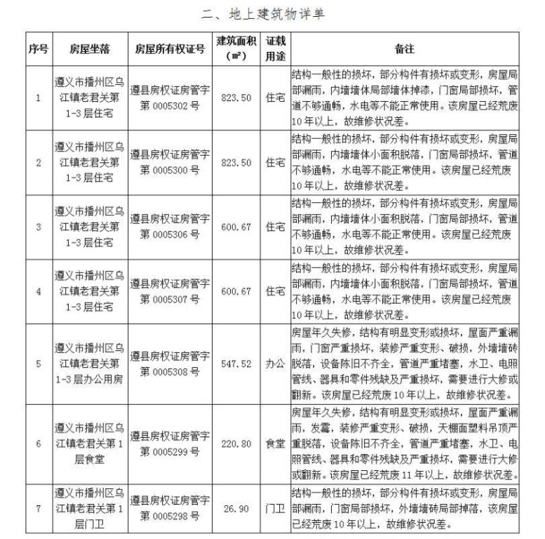 標(biāo)的名稱:遵義市播州區(qū)烏江鎮(zhèn)老君關(guān)三宗工業(yè)用地及地上住宅、辦公、食堂、門衛(wèi)用房等房地產(chǎn)