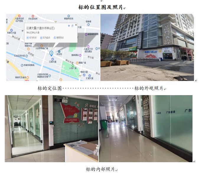 標的位于六盤水市鐘山區(qū)鐘山中路江源大廈46號6層601室的商業(yè)房地產,建筑面積為1181.04㎡,樓幢總層數為27層,所在樓憧為鋼筋混凝土結構,建成于2010年。