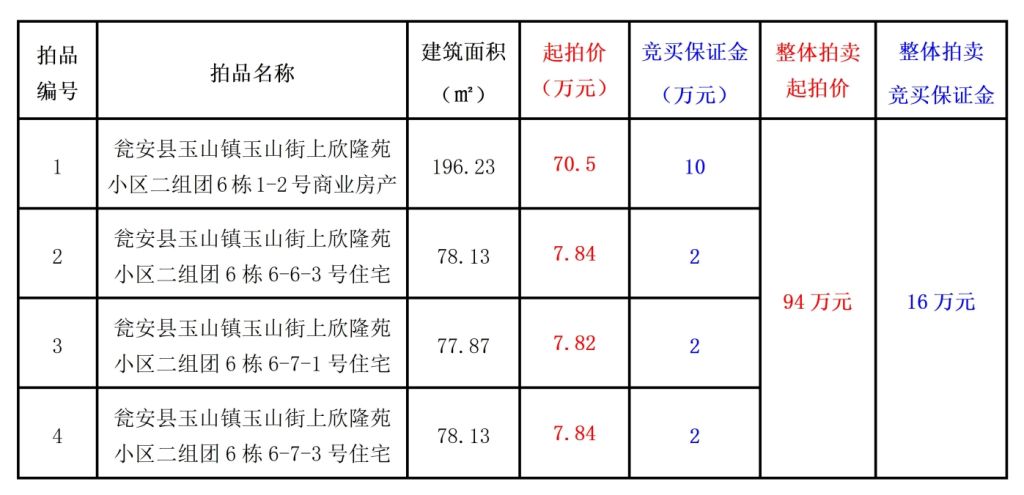 拍品編號1-4:甕安縣玉山鎮(zhèn)玉山街上欣隆苑小區(qū)二組團6棟商業(yè)用房及住房