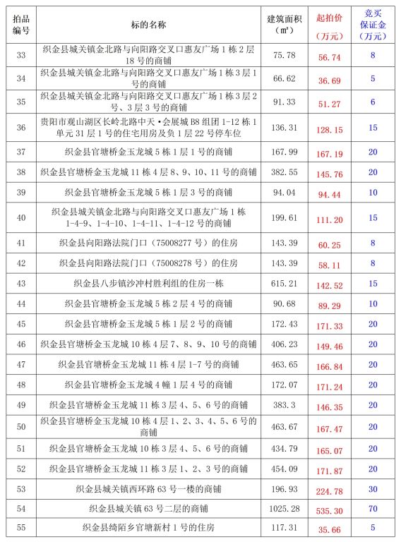 受委托,我公司定于2022年12月26日(星期一)14:30時(shí),在織金縣金中路57號(hào)(織金農(nóng)商銀行二樓會(huì)議室)公開拍賣以下標(biāo)的:織金縣房地產(chǎn)55處。(詳見標(biāo)的清單)