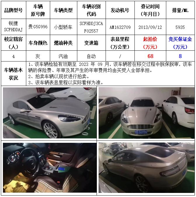【已結(jié)束】阿斯頓馬丁銳捷小型轎車拍賣公告