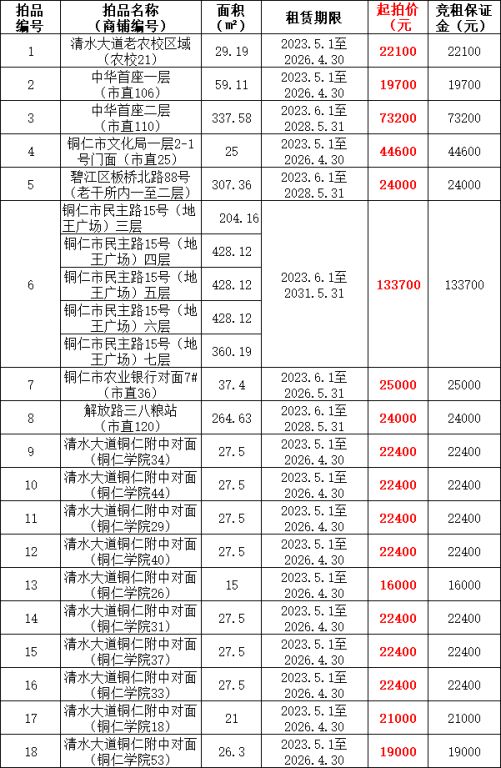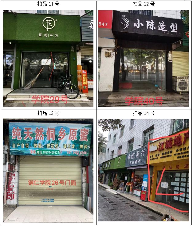 拍品9號至12號標(biāo)的:位于清水大道銅仁附中對面,面積均為:27.5㎡,租賃期均為3年(2023.5.1至2026.4.30),附近有車站、醫(yī)院、銀行、酒店、超市、學(xué)校等,交通便利,人流量大。