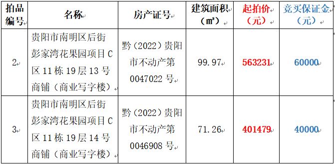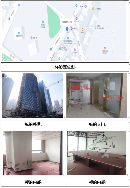 標(biāo)的位于貴陽(yáng)市南明區(qū)花果園彭家灣花果園C區(qū)(貴陽(yáng)國(guó)際中心1號(hào))11棟1單元19層13號(hào)、14號(hào)花果園商鋪(商業(yè)寫(xiě)字樓),其中標(biāo)的2號(hào)建筑面積為99.97㎡、套內(nèi)面積為73.48㎡;標(biāo)的3號(hào)建筑面積為71.26㎡、套內(nèi)面積為52.38㎡。房屋為一般裝修,包含水電敷設(shè)及安裝、地面地磚、墻面刷瓷粉及乳膠漆、頂面鋁扣板吊頂、玻璃門(mén)。用途為辦公,鋼混結(jié)構(gòu),建成時(shí)間為2013年8月,所在層數(shù)19層,目前均為空置狀態(tài)。
