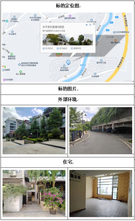 該標(biāo)的位于貴陽(yáng)市水口寺中天世紀(jì)新城三組團(tuán)B1棟1單元3層2號(hào)及貴陽(yáng)市南明區(qū)水口寺中天世紀(jì)新城三組團(tuán)G2棟負(fù)1層3號(hào)。