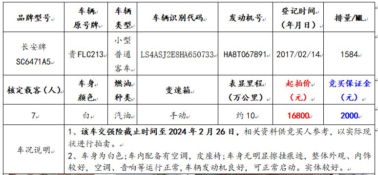 拍品編號6:長安牌SC6471A5小型普通客車一輛(車輛原號牌:貴FLC213)。