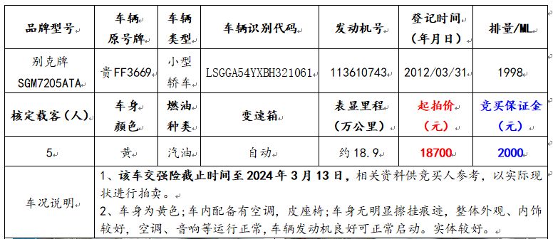 拍品編號5:別克牌SGM7205ATA小型轎車一輛(車輛原號牌:貴FF3669);