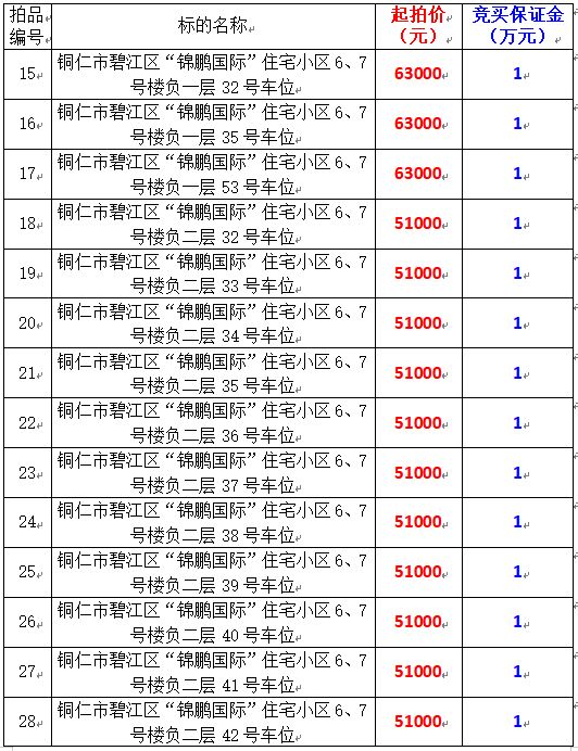 5、銅仁市碧江區(qū)“錦鵬國際”住宅小區(qū)6、7號樓負一層;32號、35號、53號,負二層;32號-47號共計19個車位,起拍價:51000元-63000元,競買保證金:1萬元/個。