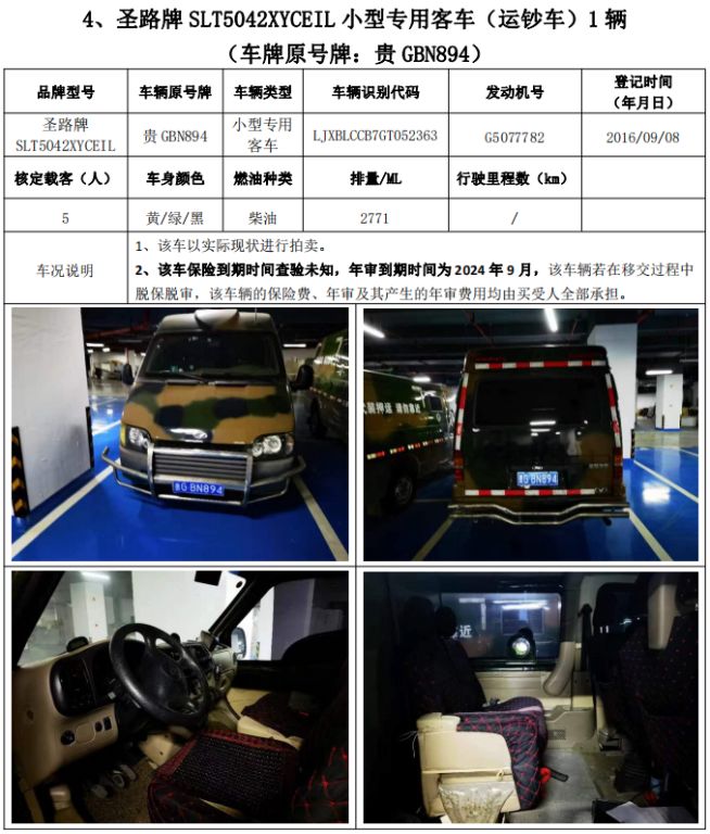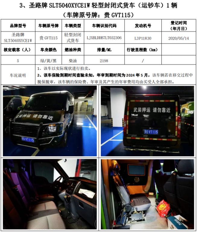 拍品編號(hào)1:圣路牌SLT5040XYCE1W輕型封閉式貨車(運(yùn)鈔車)3輛、圣路牌SLT5042XYCEIL小型專用客車(運(yùn)鈔車)1輛,共4輛,整體拍賣