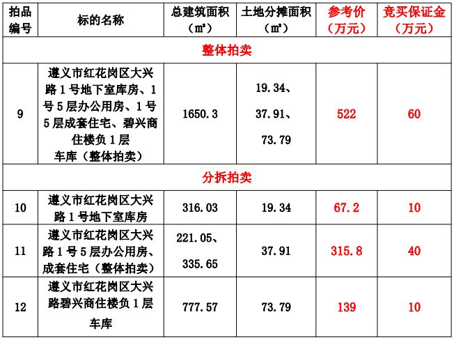 標(biāo)的:遵義市紅花崗區(qū)大興路1號(hào)地下室?guī)旆俊?號(hào)5層辦公用房、1號(hào)5層成套住宅、碧興商住樓負(fù)1層車(chē)庫(kù)