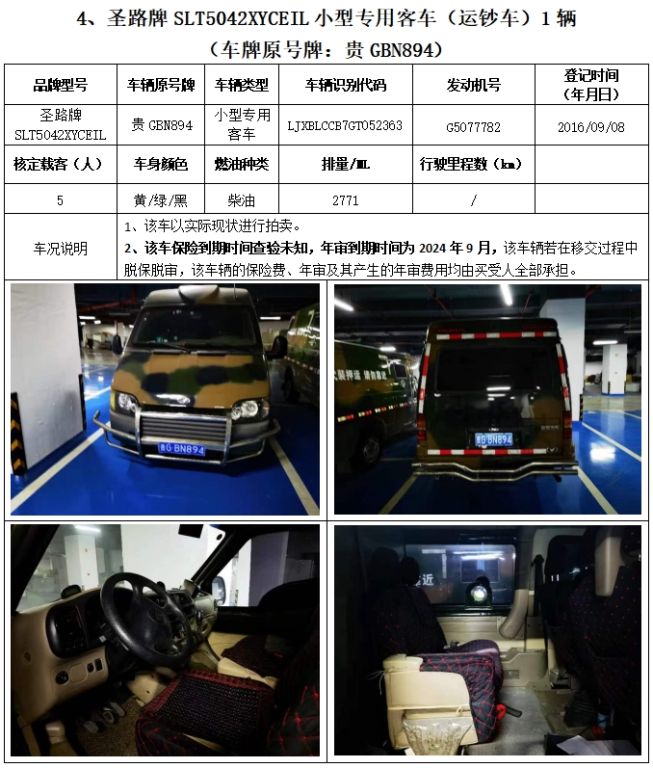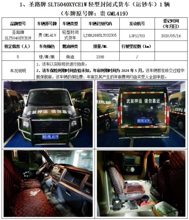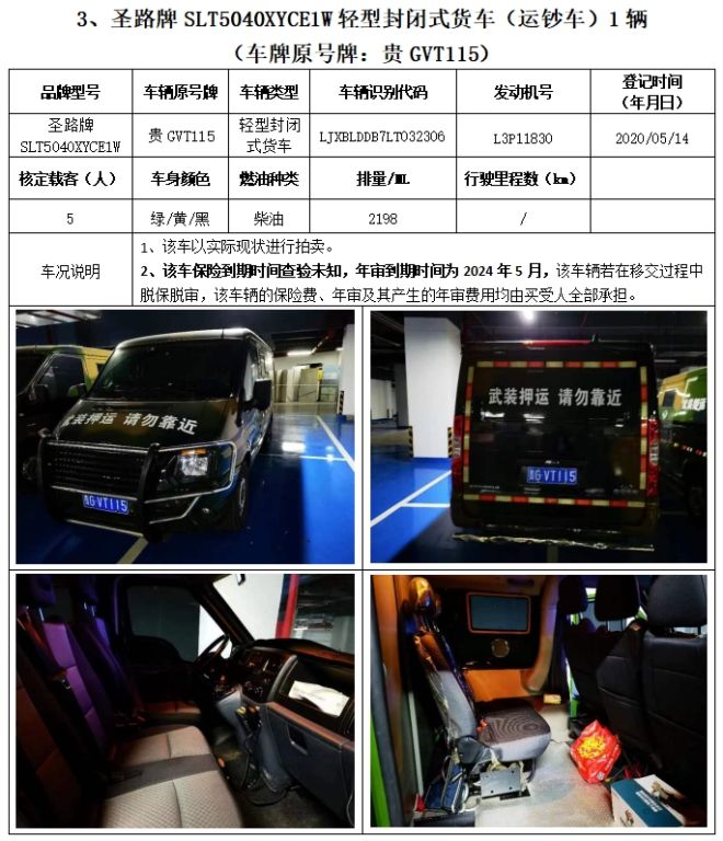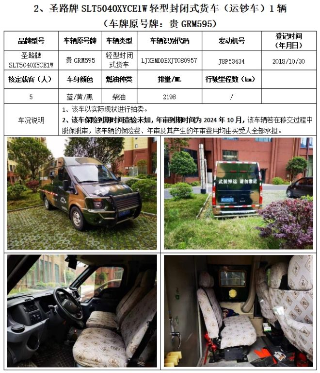 拍品編號1:圣路牌SLT5040XYCE1W輕型封閉式貨車(運(yùn)鈔車)3輛、圣路牌SLT5042XYCEIL小型專用客車(運(yùn)鈔車)1輛,共4輛,整體拍賣