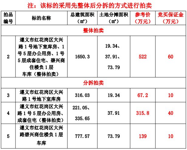 標的:遵義市紅花崗區(qū)大興路1號地下室?guī)旆俊?號5層辦公用房、1號5層成套住宅、碧興商住樓負1層車庫