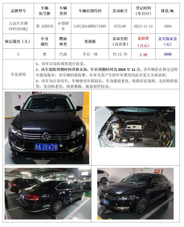 拍品編號1:大眾汽車牌 SVW72010KJ小型轎車1輛