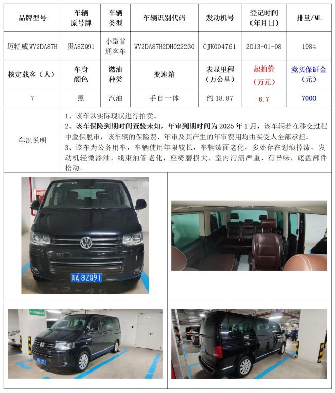 拍品編號6:邁特威WV2DA87H小型普通客車1輛