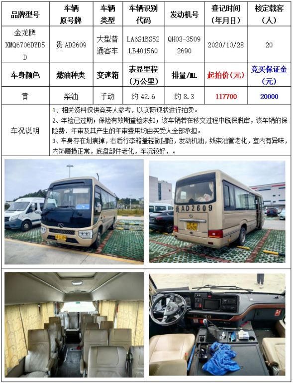 拍品編號3:金龍牌XMQ6706DYD5D大型普通客車一輛