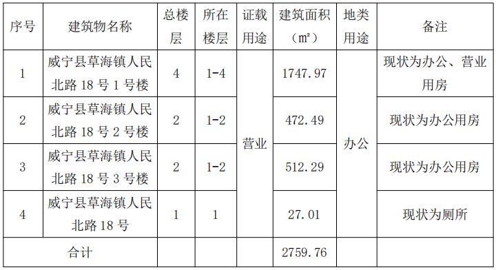 標(biāo)的坐落于威寧縣草海鎮(zhèn)人民北路18號(hào)稱(chēng)為1號(hào)樓、2號(hào)樓和3號(hào)樓的三項(xiàng)房屋,房屋建筑面積為:2759.76㎡,混合結(jié)構(gòu),房屋總層數(shù)為4層,拍賣(mài)標(biāo)的所在層數(shù)為1-4層,產(chǎn)權(quán)證號(hào):威房權(quán)證草海鎮(zhèn)字第00007730號(hào),設(shè)計(jì)用途為營(yíng)業(yè)。土地證號(hào):威國(guó)用(2009)第133號(hào),地類(lèi)(用途):辦公用地,使用權(quán)類(lèi)型:作價(jià)出資,使用權(quán)面積:1854.70㎡。