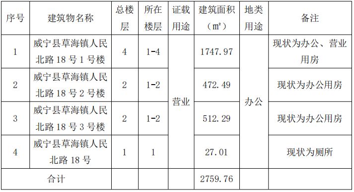標的坐落于威寧縣草海鎮(zhèn)人民北路18號稱為1號樓、2號樓和3號樓的三項房屋,房屋建筑面積為:2759.76㎡,混合結(jié)構(gòu),房屋總層數(shù)為4層,拍賣標的所在層數(shù)為1-4層,產(chǎn)權證號:威房權證草海鎮(zhèn)字第00007730號,設計用途為營業(yè)。土地證號:威國用(2009)第133號,地類(用途):辦公用地,使用權類型:作價出資,使用權面積:1854.70㎡。