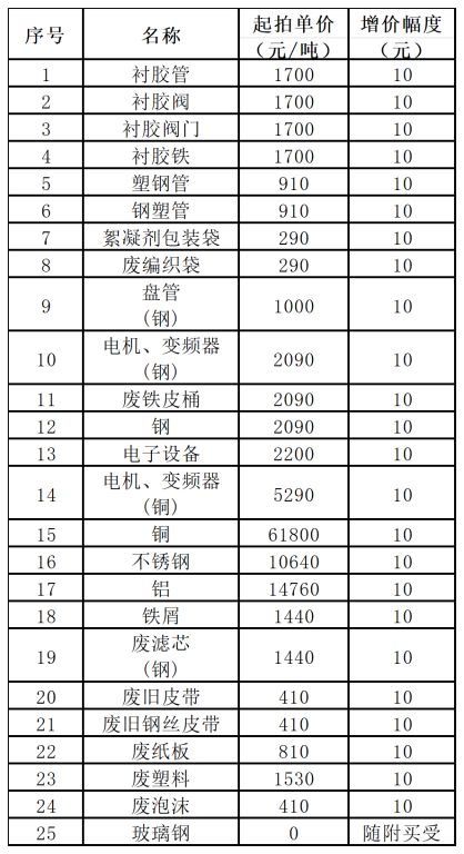 襯膠管每增加10元/噸,第2-24項(xiàng)廢舊材料同步增加10元/噸;買受人買受1-24項(xiàng)廢舊材料的同時,以起拍價隨附買受第25項(xiàng)廢舊材料。